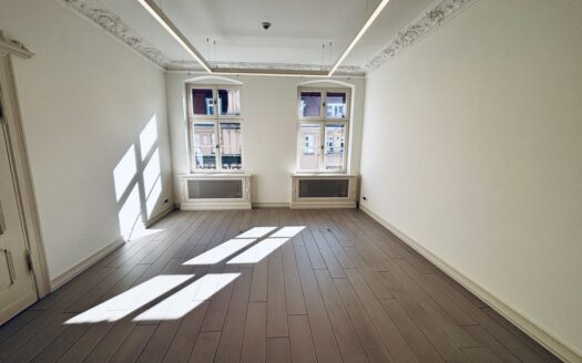 Klasyczne schody prowadzą na górne PIĘTRO z wysokimi pokojami. Tutaj samodzielne dwa pokoje/sypialnie (obie 21 m.kw); open space z kanapą (19,64 m.kw); pokój kąpielowy (duża łazienka z wanną i toaletą) (6,45 m.kw); garderoba z pralnią (5,86 m.kw).